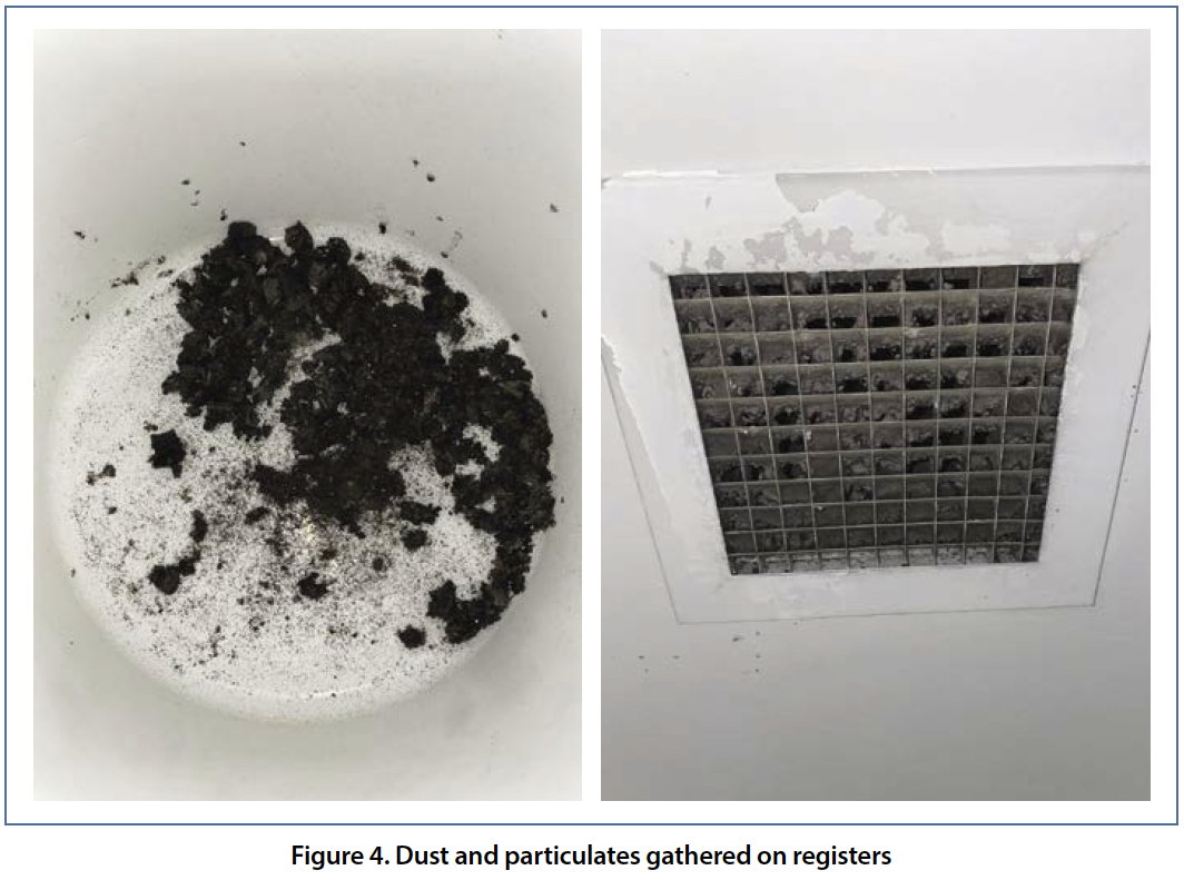 Maintenance is always a concern. Individual systems may have an advantage over central systems in simplicity of distribution, but servicing one fan in a common space is very different to servicing 12 fans in occupied units. Though a constant exhaust does not filter supply air, it clearly does remove particulates, as demonstrated by their accumulation on the roof and on registers in the unit. Still, dirty registers draw less air.